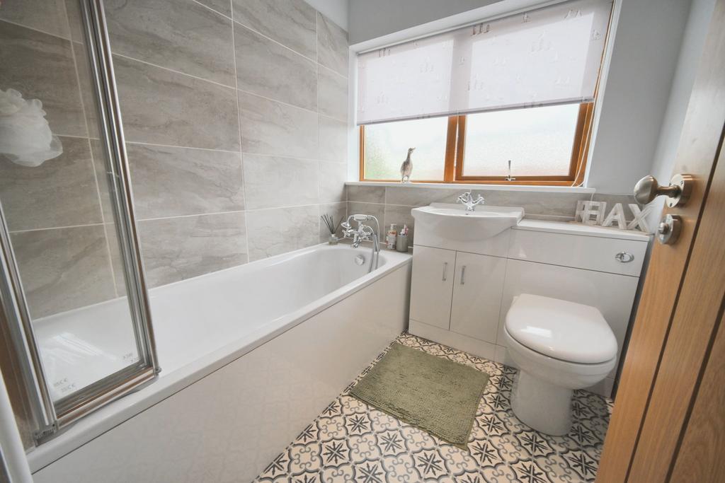Bathroom: 6’3’’ (1.90m) x 5’10’’ (1.78m) Fitted with a smart white suite comprising panelled bath with shower unit & handheld spray, vanity unit, recessed WC & storage cupboards, graphite heated towel rail, part tiled walls, recessed ceiling spotlights, tiled effect cushioned flooring and double glazed opaque window to rear.