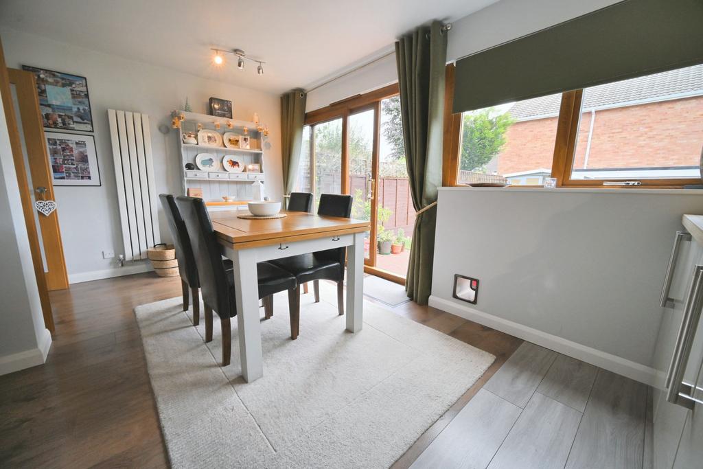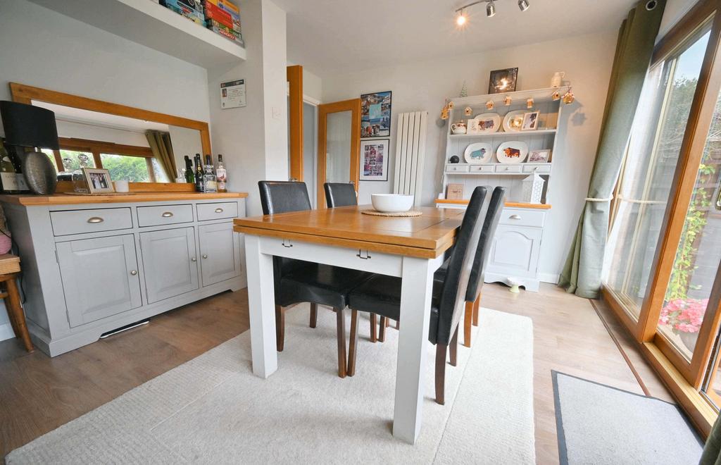 Living Room: 14’9’’ (4.50m) x 14’4’’ (4.36m) Internal hardwood opaque glazed door, covered radiator, staircase to first floor with built in cloaks cupboard below, laminate flooring and double glazed picture window to front. Internal hardwood glazed double doors lead to: