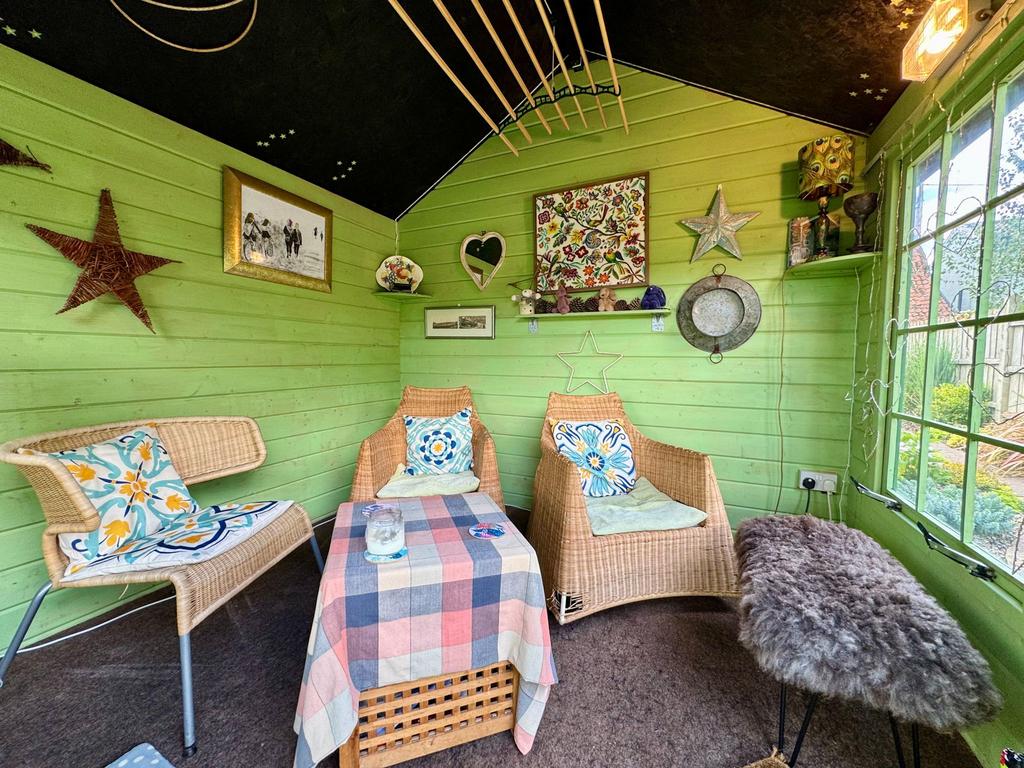 A well-maintained and thoughtfully arranged outdoor space. A paved area adjoins the kitchen with a door opening to the garden, leading to a pathway and seating area. This continues to a summerhouse and an adjacent garden store with light and power. Beyond is a lawned area with an original brick-built outbuilding. The garden backs onto scenic meadowland and is well stocked with a variety of mature plants. Two external taps and external lighting.