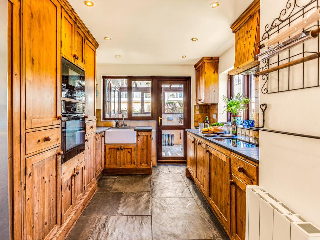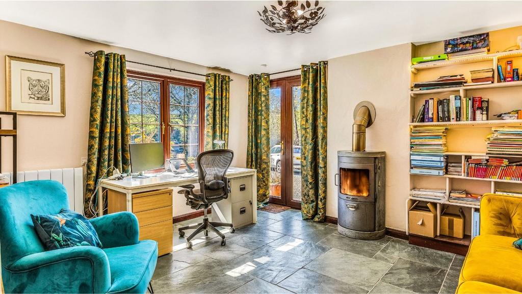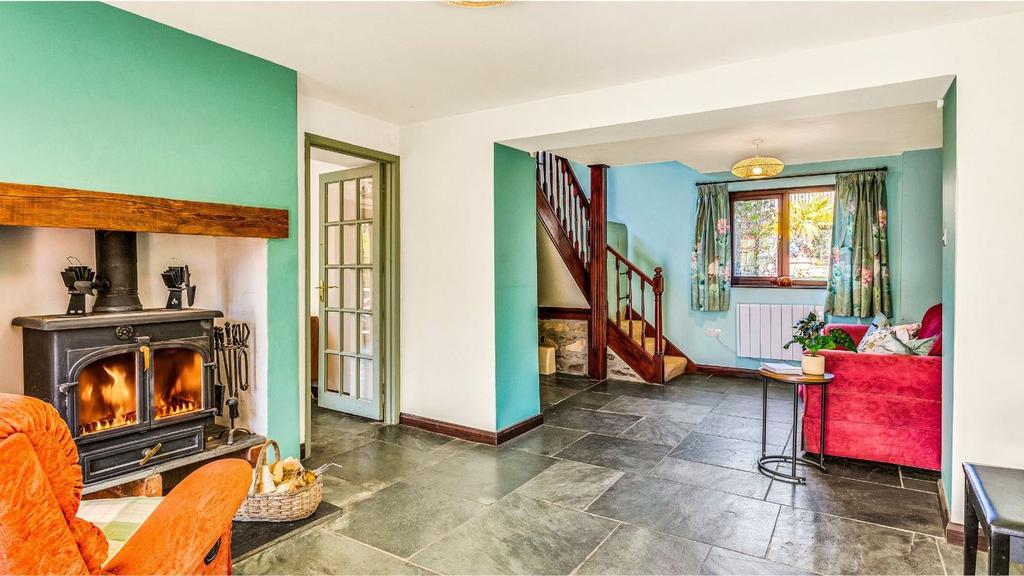 The three-bedroom house is full of character—flagstone floors, a Rayburn range, solid slate worktops and thick stone walls. In traditional farmhouse style, it is solid, warm and dependable. The farmhouse kitchen has a Belfast sink and plenty of room to prep produce from your own land. Downstairs, the layout flows easily between the conservatory, living room, snug/office, and boot room—ideal for coming back in from the grounds or workshop.
