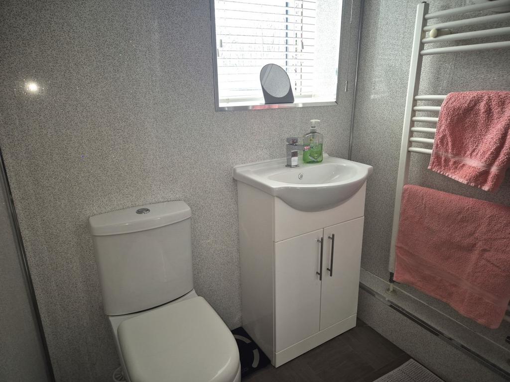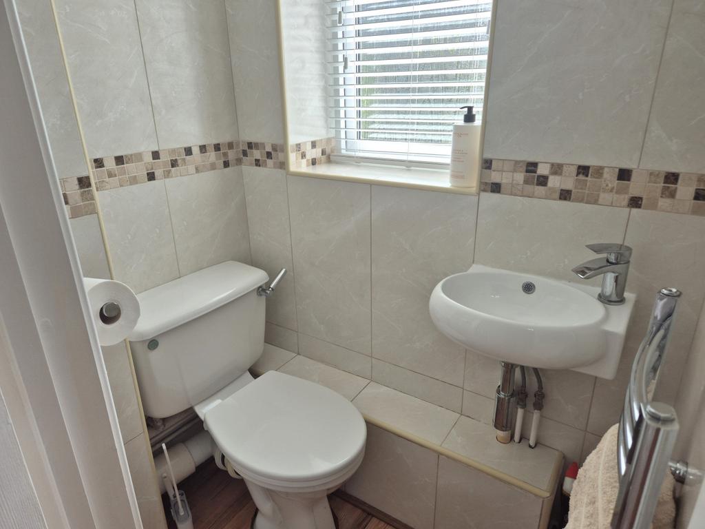 CLOAKS - Fitted with white wash hand basin and w.c. uPVC double glazed window to front. Chrome heated towel rail. Tiled walls.