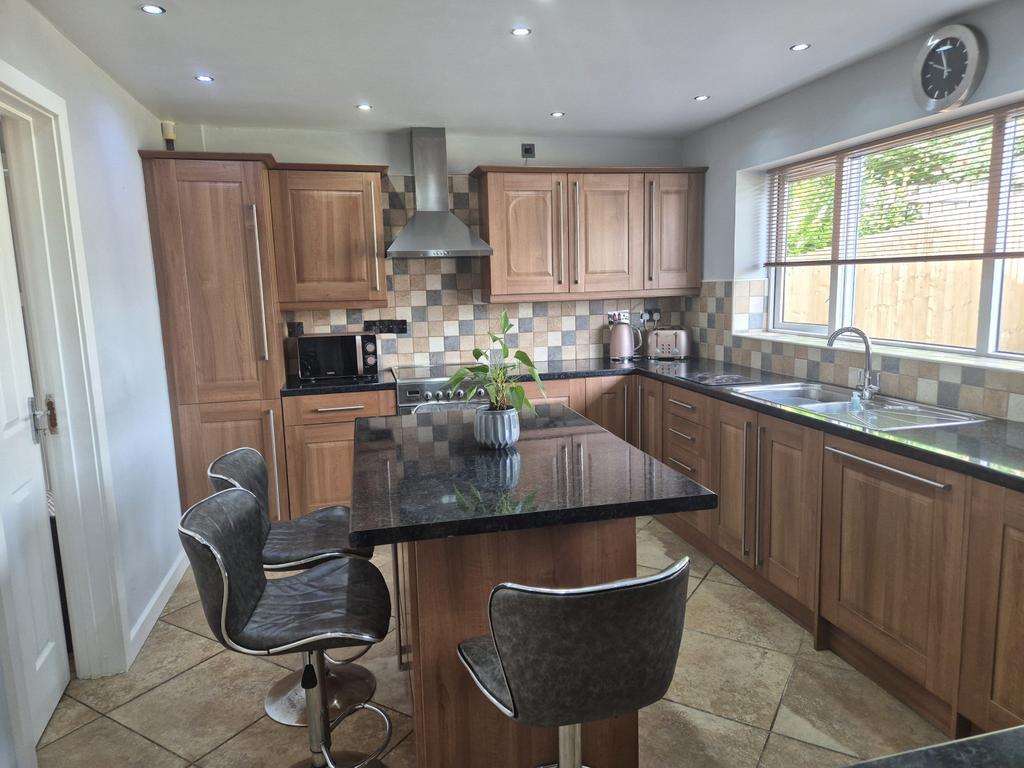 KITCHEN - 14’5 x 12’1 Fitted with a range of base and wall units with granite effect work surfaces over and tiled splash back. One and a half bowl stainless steel sink unit. Electric oven with four ring hob and stainless steel extractor over. Integrated fridge and dishwasher. Central island with storage under. uPVC double glazed window to rear. Door to utility room. Understairs storage cupboard. Tiled flooring. Spotlights to ceiling.