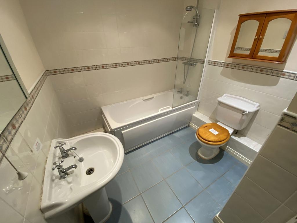 White three piece suite comprising panelled bath with shower over, pedestal wash basin, partly tiled walls, low level w.c. radiator, extractor fan, tiled floor, down lighting.