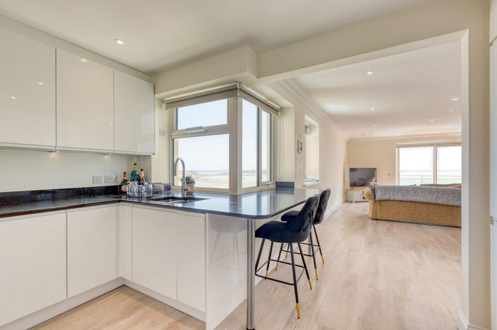 Presented in walk-in condition, the apartment features a bright and airy open-plan living/dining space, complete with sliding doors to a south-facing balcony, perfect for relaxing or entertaining. The adjoining kitchen is well-appointed with quality appliances and enjoys the same breathtaking sea views.
