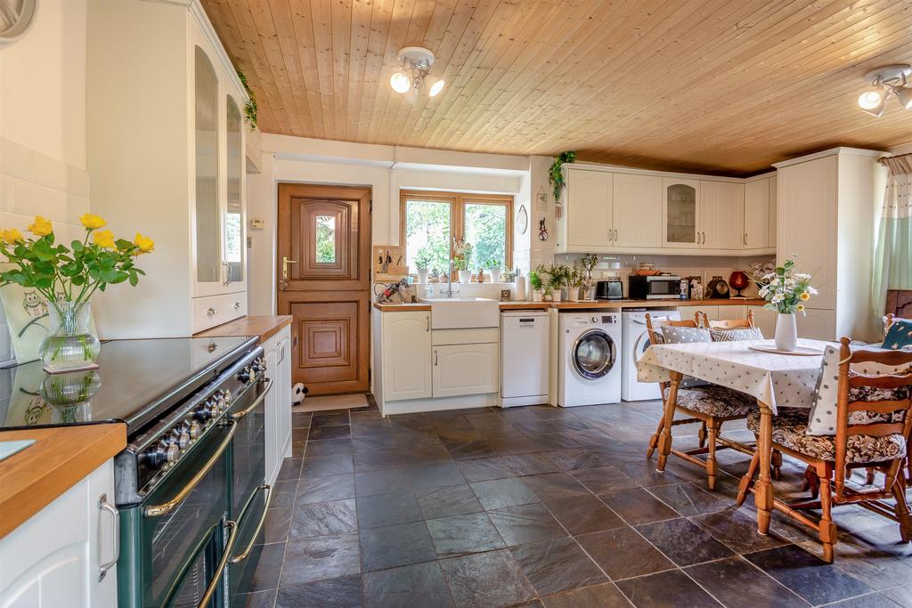 STEP INSIDE: - Upon entering via a stable door, you are welcomed into the heart of the home: a generous kitchen/family room. This charming space features a well-appointed fitted kitchen with a flag stone floor, ample room for dining and lounge furniture, and a characterful wood-burning stove enclosed within a characterful brick fireplace, creating a cosy and inviting atmosphere. French doors open out to the rear garden, seamlessly blending indoor and outdoor living.