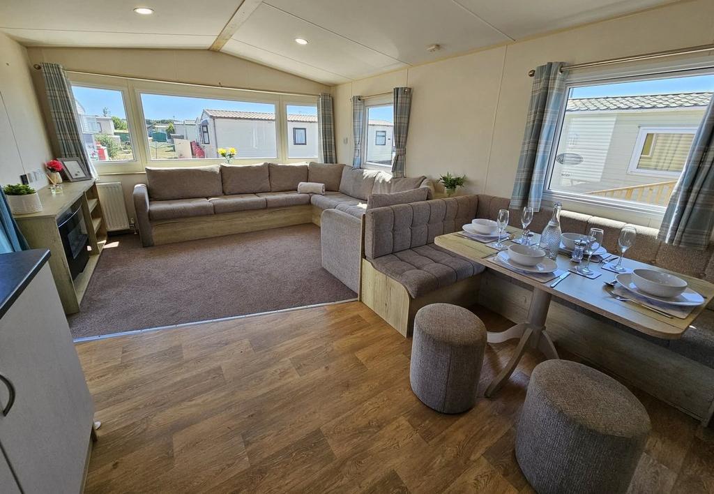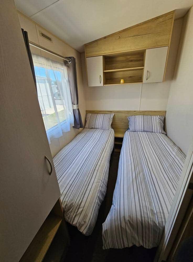 The ABI Trieste 3 Bed is a good size at 36ft x 12ft and comes with double glazing & central heating, an open-plan living area with a large built-in sofa that will comfortably fit all the family (also with a built-in sofa bed beneath), a large TV display cabinet, and a couple of storage cupboards and shelves. The kitchen is a very good size and comes with a gas cooker & hob (with an extractor), a full-size fridge & freezer, and plenty of storage cupboards. There's also a large dining table with built-in seating and two stools.