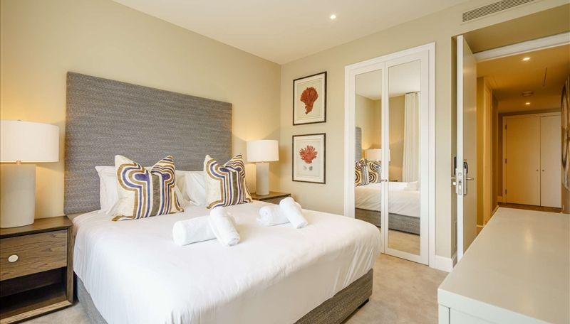 Both bedrooms are generously sized and include mirrored fitted wardrobes. The primary bedroom benefits from a luxurious marble en-suite bathroom, and there is an additional guest bathroom for convenience.