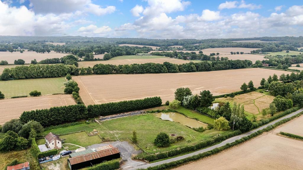 Constructed circa 2006, the farmhouse has distinctive elevations of part brickwork and part colour washed rendering. There are 3 bedrooms and 2 bathrooms to the first floor, whilst on the ground floor there is a hall/cloakroom, sitting room with wood burner and a generous kitchen dining room. There is the benefit of oil fired central heating from radiators. There is ample space around the house to extend the property, subject to the local authority consents being obtained. To the west of the house, there is an extensive range of outbuildings. Planning consent was granted in November 2022 by Tandridge District Council under reference 2022/1000 for demolition of the buildings and erection of two detached houses. The consent expires in October 2025. Purchasers are advised, therefore, to discuss their specific requirements for these buildings with the planning department at Tandridge. There is a LAKE situated towards the southern boundary. In the past, the property was a thriving fish farm, although the business closed some years ago. The holding would be ideally suited to a family seeking a rural environment and lifestyle. In all, the grounds extend to about 2.9 acres.