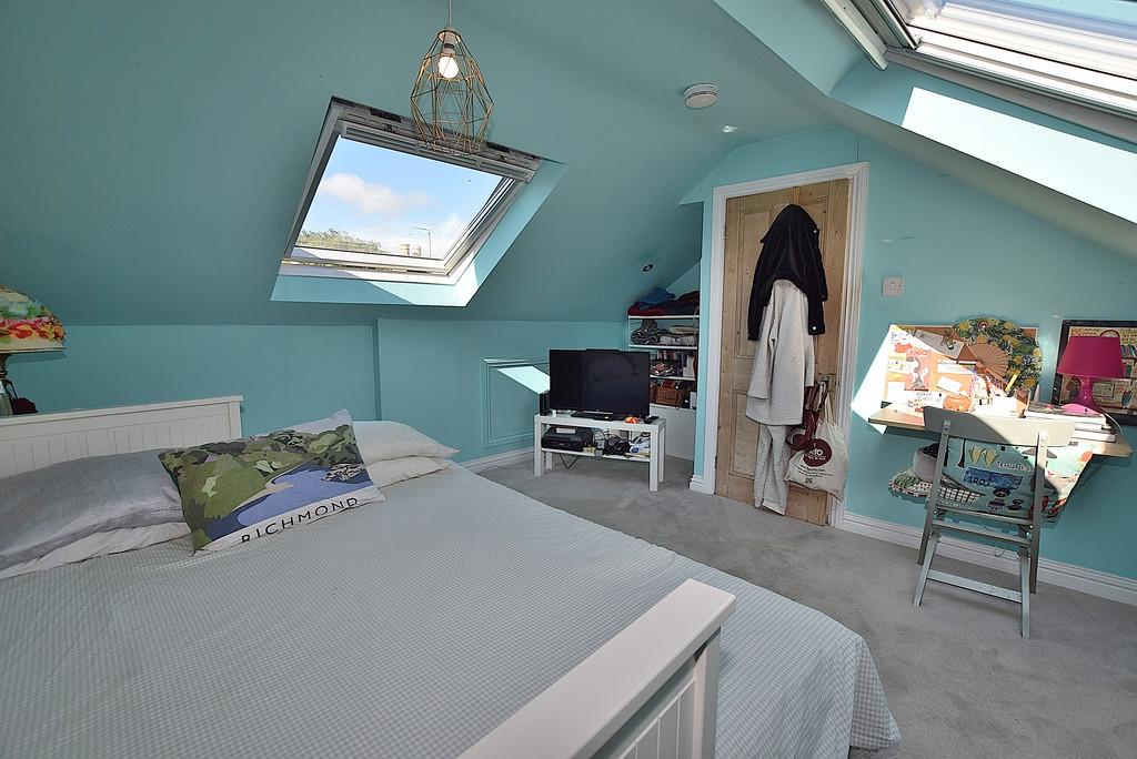 BEDROOM A double bedroom having Velux roof windows to the front and rear of the property, eaves storage, a TV point and a radiator.
