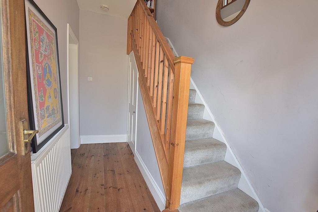 ENTRANCE HALL Accessed through a part glazed timber door the welcoming hallway features exposed floorboards, a radiator and a useful under stairs cupboard.
