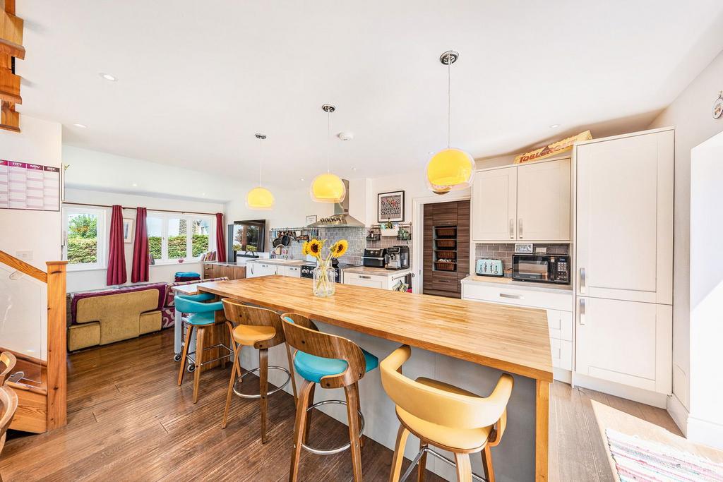 This remarkable renovation, showcases an expansive open-plan kitchen, dining, and family room beneath soaring, vaulted ceilings with exposed timber beams and engineered oak flooring with underfloor heating. Natural light floods the space through oversized double glazed windows and bi-fold glass doors, which open onto a landscaped garden, creating a seamless indoor-outdoor connection. The kitchen sits at the heart of the room, featuring a large central island with solid wood countertop, ceramic sink & drainer with instant hot water tap and waste disposal unit, range style cooker with induction hob and integrated fridge/ freezer and dishwasher. The custom cabinetry is in a muted, modern palette, the boot room fitted with contemporary wood cabinets and cloakroom is accessed at the rear and also provides access to the side of the property. Adjoining the kitchen is a generous living / dining area, with space for a large farmhouse-style table, ideal for entertaining. Beyond this, the family room offers a cosy yet airy atmosphere with a statement log burner, soft seating, and a blend of rustic textures and modern finishes, a door leads you onto a decked terrace with steps leading down to the private side garden and garden office.