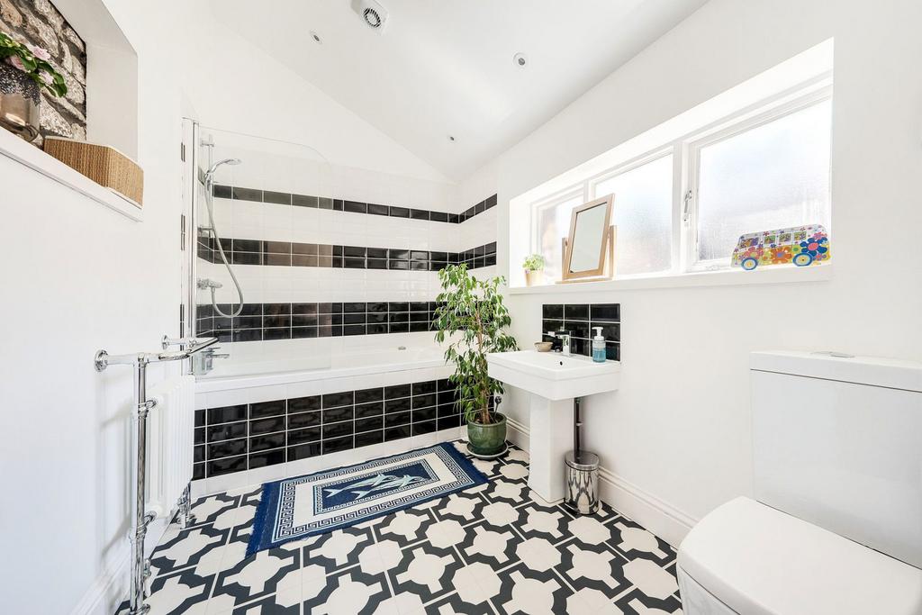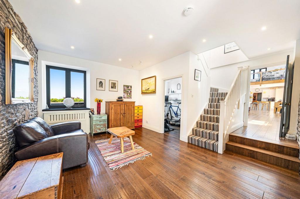 The church style wooden gate invites you through to the quintessential private gardens, as you enter the property into the entrance hall you are welcomed with exposed stonework complemented with white render, door to family bathroom with tiled floor, double glazed windows to the garden, bath with glass screen and shower over, pedestal wash hand basin with tiled splash back and wc. Door through to the spacious principle room, flooded with natural light from windows to both the front and rear, this room offers a lot of space to create an indulgent principle room. A study is also found off the hallway and stairs rising to the first floor.