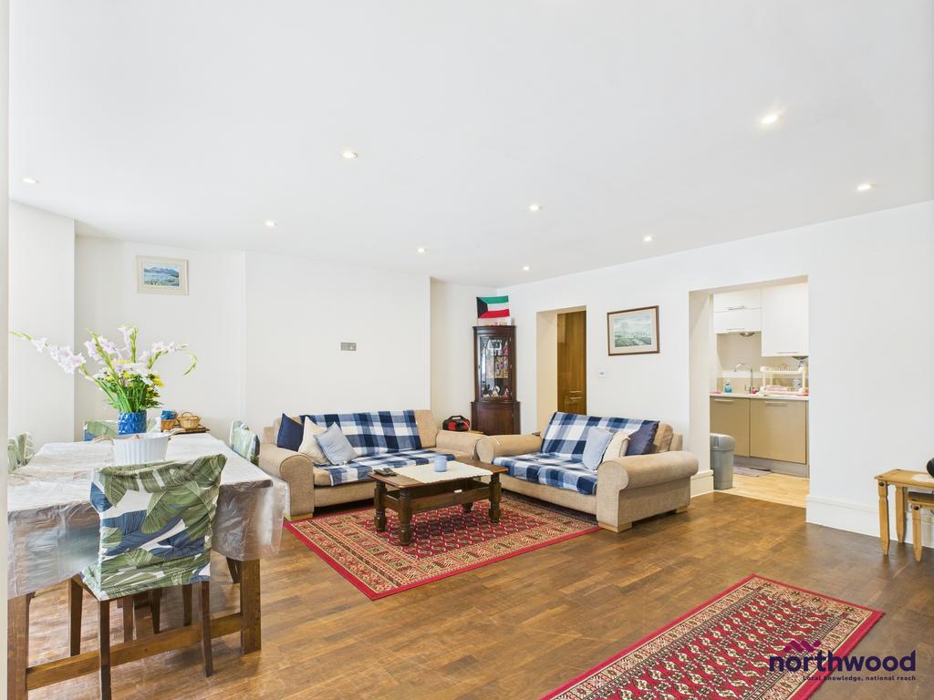 Large living space with dark wood flooring, inset spotlights, radiator and period sash windows in a circular bay to front aspect