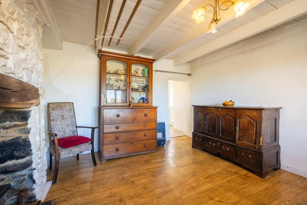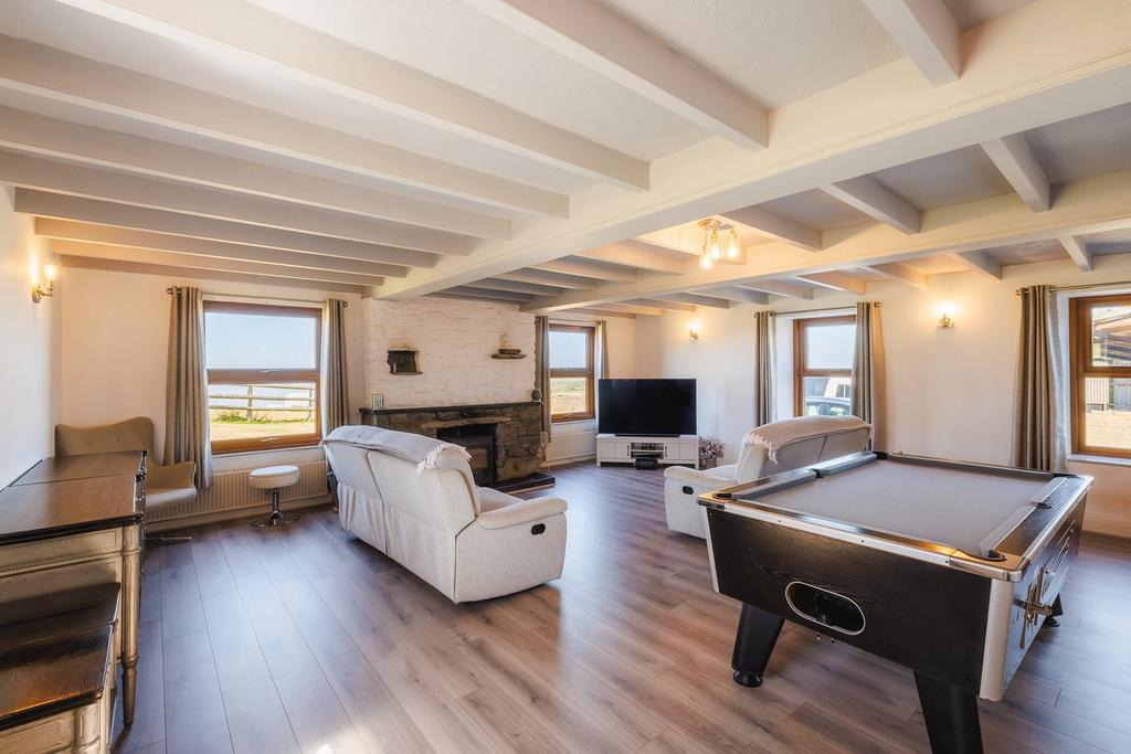 Caerhys is the main farmhouse, offering generous and well-proportioned accommodation ideally suited for family living or entertaining guests. The ground floor features a large, welcoming sitting room with expansive views stretching out towards the coastline, creating a perfect space for relaxing and enjoying the peaceful surroundings. Adjacent to the sitting room is a traditional farmhouse kitchen and dining area, blending character with functionality and offering ample space for both everyday use and special occasions. A useful utility room provides additional storage and workspace, while a downstairs cloakroom adds further convenience to the layout.