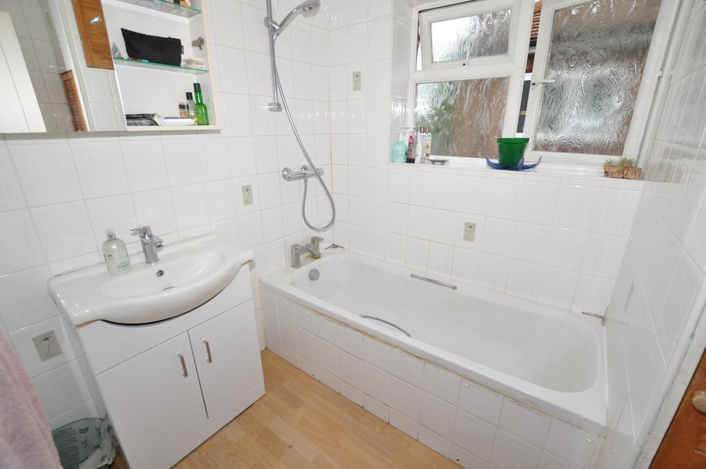 Bathroom: Tiled walls, panelled bath with mixer tap, shower, vanity wash hand basin with mixer tap, ladder-style heated towel rail, double glazed window.