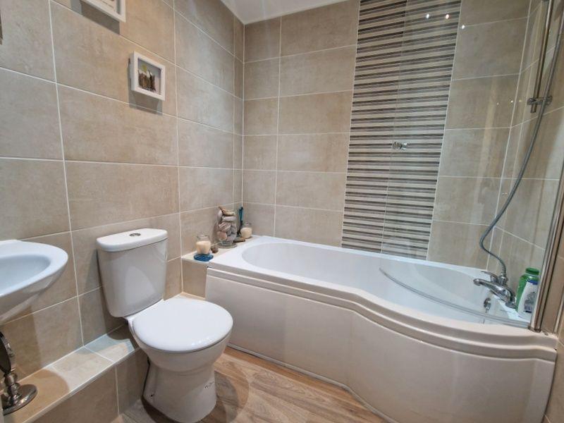 BATHROOM/WC: 2.08m x 1.88m (6'10" x 6'2") A modern suite comprising bath with shower attachment and curved shower splash screen, pedestal wash hand basin, WC with push button flush, chrome heated towel rail, fully tiled walls, wood-effect flooring, recessed ceiling spotlighting, ceiling extractor fan.