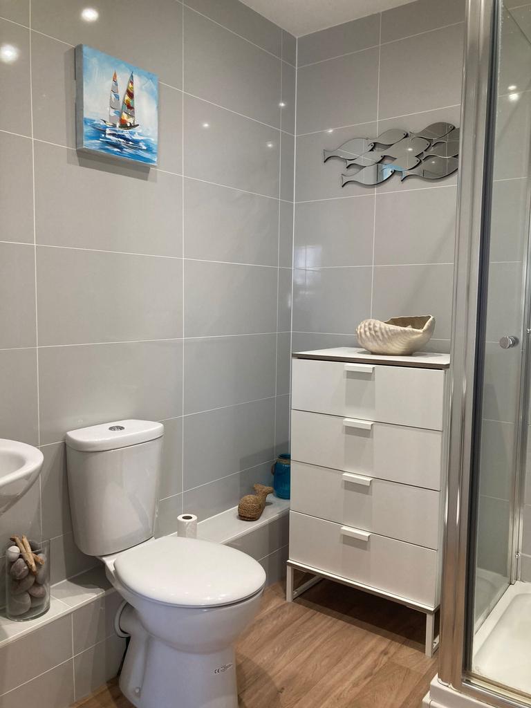 EN-SUITE SHOWER ROOM/WC: 2.01m x 1.8m (6'7" x 5'11") With shower cubicle with shower splash screen door, shower unit with fixed shower rainfall head hose and detachable hose, pedestal wash hand basin, WC with push button flush, chrome heated towel rail, fully tiled walls, recessed ceiling spotlighting, ceiling extractor fan, wood-effect flooring.