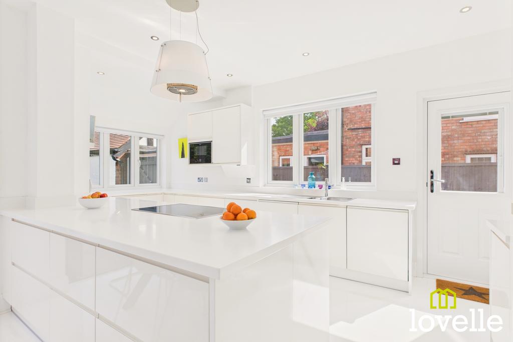 Upon entering the ground floor, you are welcomed into a truly versatile and beautifully appointed living space designed with modern family life in mind. To the front, a generously proportioned family room features a charming bay window, allowing natural light to cascade through the space, creating a bright yet homely atmosphere. To the rear, sleek bi-folding doors open fully onto the raised decking area, effortlessly connecting the indoors with the outdoors and providing the perfect setting for summer gatherings or quiet evenings overlooking the garden. A second reception room, with dual-aspect windows to the front and side elevations, offers excellent versatility. Generous in size, yet maintaining a warm and intimate ambience, this room lends itself perfectly as a formal sitting room, a snug, or even a home cinema. Both reception rooms are enhanced by inset Stovax multi-fuel fires, offering a stylish focal point and a cosy retreat during the cooler months. Positioned to the rear of the property is a stunning open-plan kitchen, dining and living space – truly the heart of the home. Designed with both style and functionality in mind, this expansive area is ideal for family gatherings, relaxed evenings, and entertaining guests. Modern bi-fold doors open seamlessly onto the decking, creating an effortless indoor–outdoor flow, while large windows to the rear and side elevations bathe the space in natural light throughout the day. The contemporary kitchen is fitted with a wide range of sleek white base and wall units, offering excellent storage solutions, complemented by high-quality work surfaces and a selection of integrated appliances designed to cater for every culinary need. There is ample space for a large family dining table and a comfortable seating area, ensuring this open-plan design remains practical as well as stylish. A convenient side door leads directly to the driveway, providing easy access to and from the home. This thoughtfully designed ground floor layout strikes the perfect balance between spaciousness and warmth, making it ideal for everyday living whilst also being perfectly suited to hosting family and friends. The ground floor features underfloor heating in the reception rooms, hallway and kitchen. The ground floor is also served by a guest WC comprising of low flush toilet and hand basin.