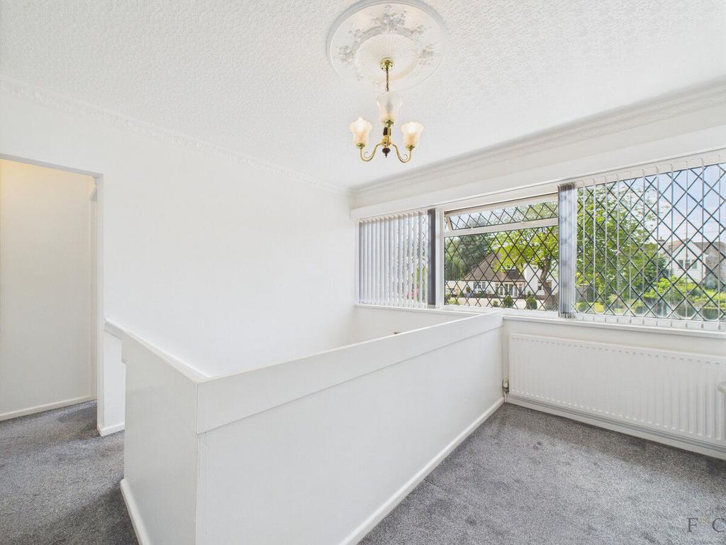 The floating staircase leads up to a wide, light-filled landing. From here, discover five generously proportioned bedrooms, each offering excellent space for family members, guests, or a home office. Some rooms benefit from fitted wardrobes, and all share use of a stylish family bathroom complete with a corner bath and overhead shower.