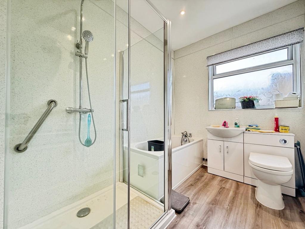 Fitted with a white three piece suite comprising of W/C, sink set in vanity unit, walk in shower, bath, respatex walls, radiator, uPVC double glazed frosted window to side elevation.