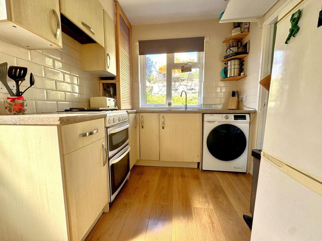 Roll edged worksurfaces with cupboards and drawers under and matching wall units, single drainer one and a half bowl stainless steel sink unit with mixer tap, gas cooker point, plumbing for washing machine, cupboard housing gas boiler which serves domestic hot water and central heating system, tiled splashbacks, PVCu double glazed window to rear, PVCu double glazed door to side.