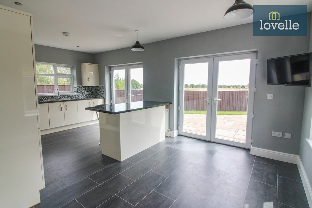 The heart of the home is undoubtedly the stylish open-plan kitchen, which has been designed with both practicality and comfort in mind. Fitted with modern units and high-quality worktops, the kitchen boasts a built-in double oven, a four-ring electric hob, integrated fridge freezer, and integrated dishwasher, making it a chef's delight. There is a breakfast bar area with additional storage below where morning meals can be enjoyed, and the patio doors lead directly onto the rear garden, creating a wonderful indoor-outdoor flow – ideal for summer gatherings and alfresco dining.
