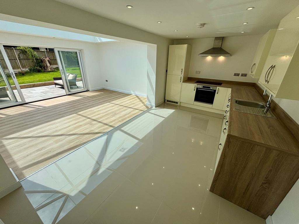 17' 9" x 9' 9" (5.41m x 2.97m). A modern and stylish gloss kitchen with a range of wall and floor units with work surfaces over stainless steel sink and drainer unit with flexi tap, integrated fridge and freezer, Bosch oven and Neff electric hob with extractor hood over, porcelain tiled flooring.