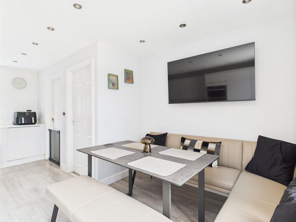 Fitted with a range of white high gloss wall and base units with composite splash back and work surfaces which incorporate a one and a half bowl sink and drainer with mixer tap. Integrated dishwasher, oven, microwave, fridge and freezer. Induction 4 ring hob with extractor hood over. Spotlights to the ceiling, uPVC double glazed window to the front and rear elevation. Door leading to utility room.