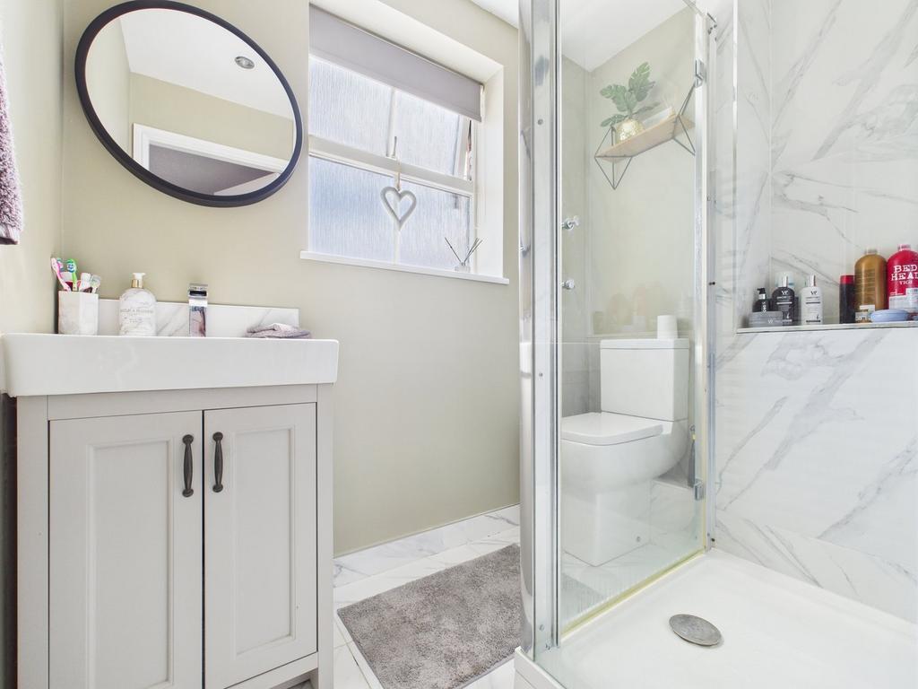 White two piece suite comprising a low flush WC and a hand wash basin with mixer tap housed in a vanity unit. Walk in shower cubicle with glass doors. Tiled flooring, spotlights to ceiling, anthracite towel rail and obscure uPVC window to front elevation.