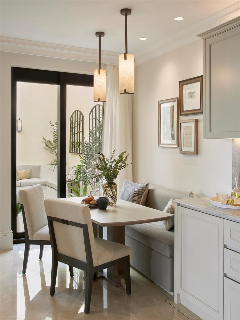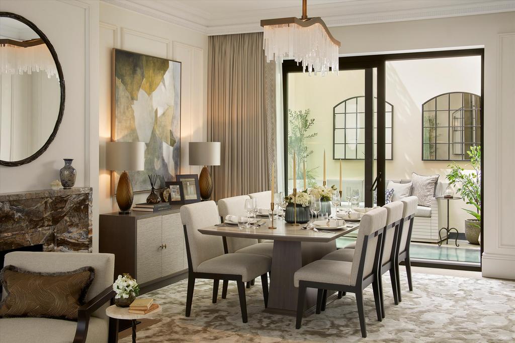 The ground floor includes a formal reception and dining room with bespoke joinery, Crestron AV, and an original marble fireplace. The kitchen features Crema Marfil marble floors, Naca quartzite worktops, Miele appliances, and a built-in banquette. There is also access to a private rear patio with integrated seating.
