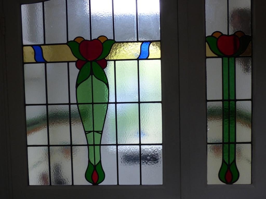 Original tiled flooring, part tiled walls, stained glass door with matching side window opens into: