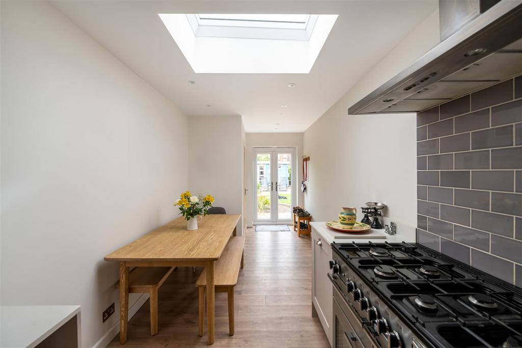 To the rear, the kitchen/diner room is a real highlight - a contemporary space, thoughtfully extended to create a stylish and sociable setting for informal dining. Finished with attractive cabinetry, sleek quartz worktops, a range cooker and underfloor heating, the kitchen is further enhanced by French doors that seamlessly connect indoor and outdoor living. A convenient guest cloakroom is also tucked away at the rear of the ground floor.