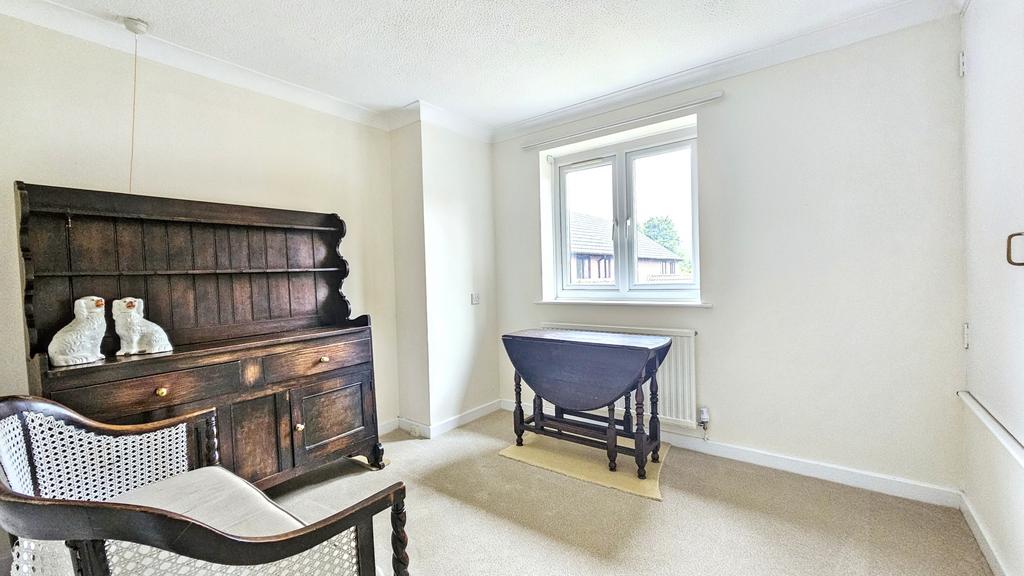 BEDROOM 1 with fitted carpet, coving, rear window overlooking the communal gardens. Coving, deep storage cupboard, radiator, emergency pull cord, two power points, telephone point, and glazed panelled door from hall.