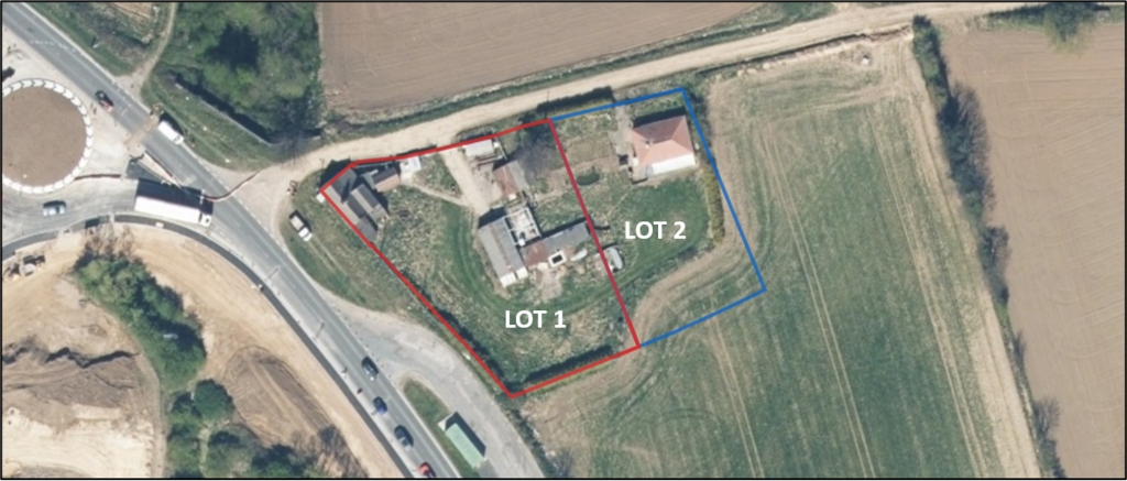 Lot 2, Edged in blue upon the attached plan, comprises a detached, double-fronted bungalow of red brick construction beneath a red clay tiled roof, understood to date from the 1950s or 60s.