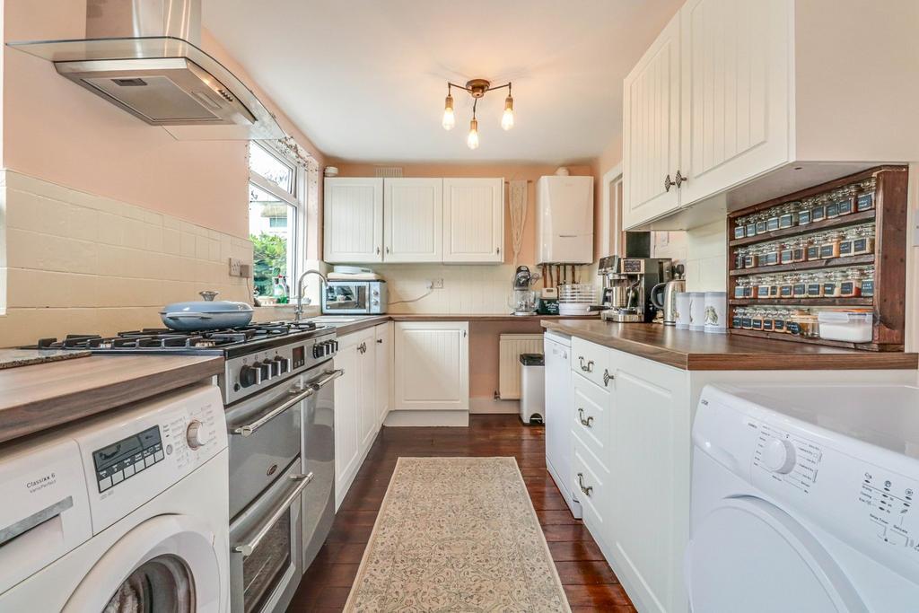 The kitchen comprises a range of base and eye level storage units complemented by the square edge work surfaces with inset sink and mixer tap. Tiled splashbacks. Space for Range style oven under extractor. Space and plumbing for washing machine, tumble dryer and dishwasher. Space for freestanding fridge-freezer. Space for small breakfast table ahead of double glazed French doors that open onto the rear garden. Wall mounted boiler. Double glazed windows to rear aspect.