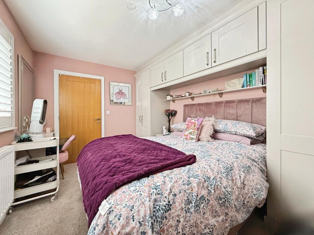 Carpeted underfoot, fitted cupboard, fitted bed surround, uPVC double glazed window to front elevation with shutter blinds, radiator, door into: