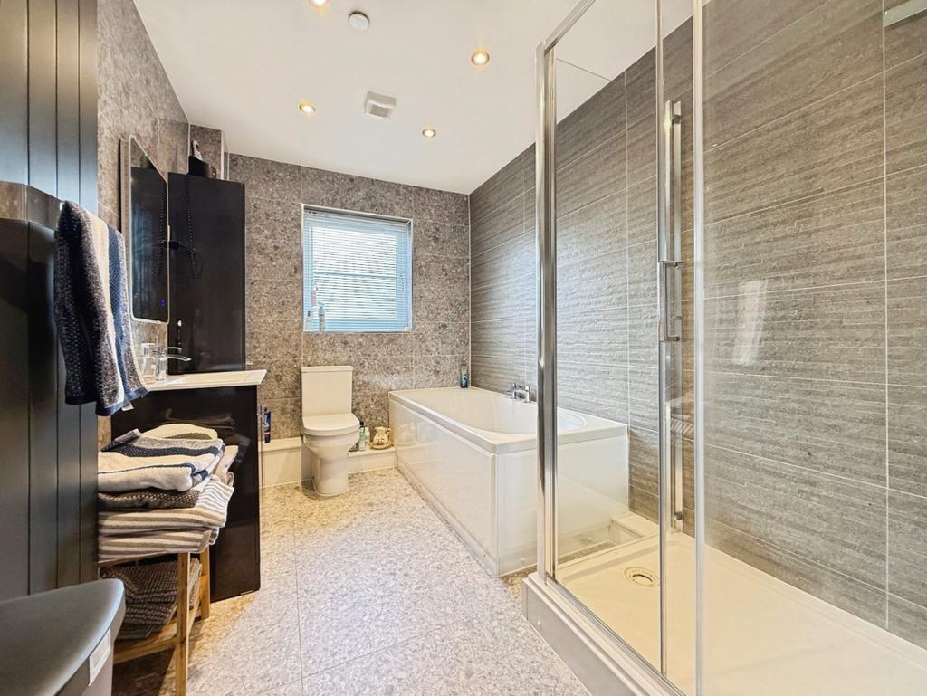 Fitted with a white four piece suite comprising of W/C, sink set in vanity unit, panelled bath, walk in shower with glass modesty screen, fully tiled, spotlights to ceiling, grey vertical radiator with towel bar, uPVC double glazed frosted window to rear elevation.