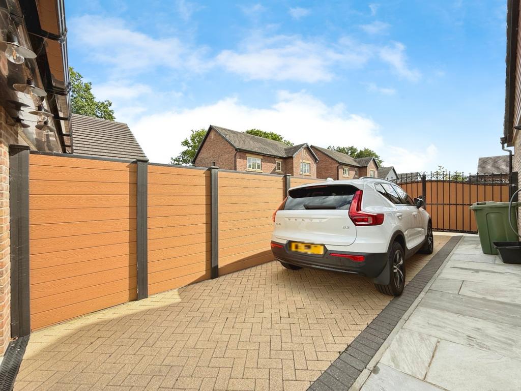 To the right hand side of the property there is an enclosed gated driveway surrounded by composite fencing and featuring a large block paved driveway leading to a single garage featuring power and lighting, electric front door, side door.