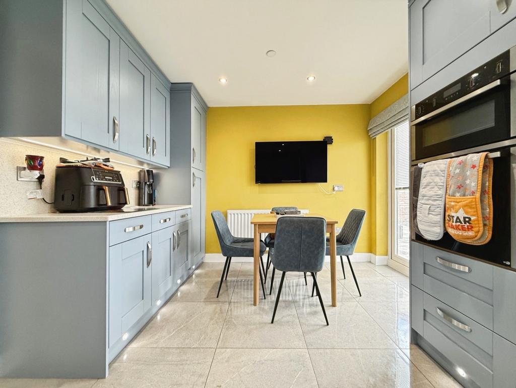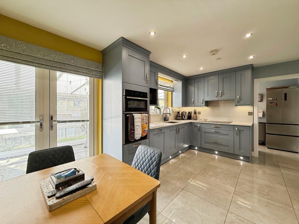 Fitted with a new and upgraded Sigma3 Kitchen with fully integrated appliances, comprising of matching wall and base units in shaker style with complimentary granite work surface and upstands over, inset sink with mixer tap and drainer grooves, integrated ‘NEFF’ eye level oven and grill, integrated ‘NEFF’ microwave, integrated dishwasher, four ring induction hob with concealed extractor above, matching cornice, under cabinet and plinth lighting, feature spotlights to units, spotlights to ceiling, high gloss tiled flooring, radiator, uPVC double glazed patio doors and window to rear elevation, opening into: