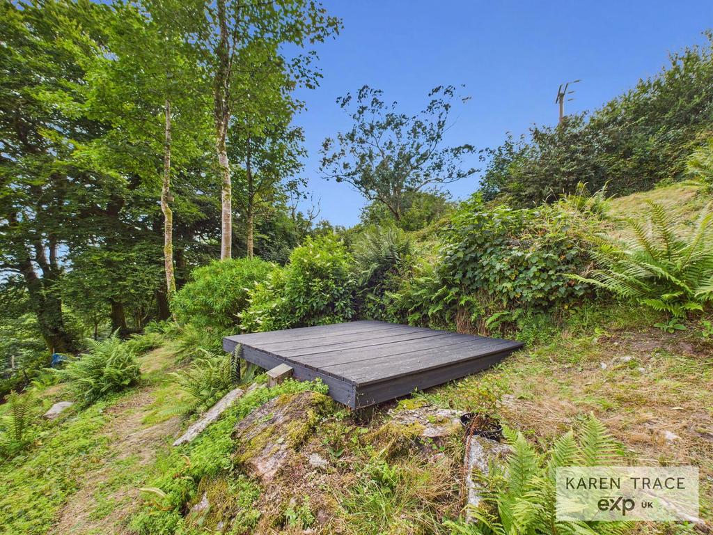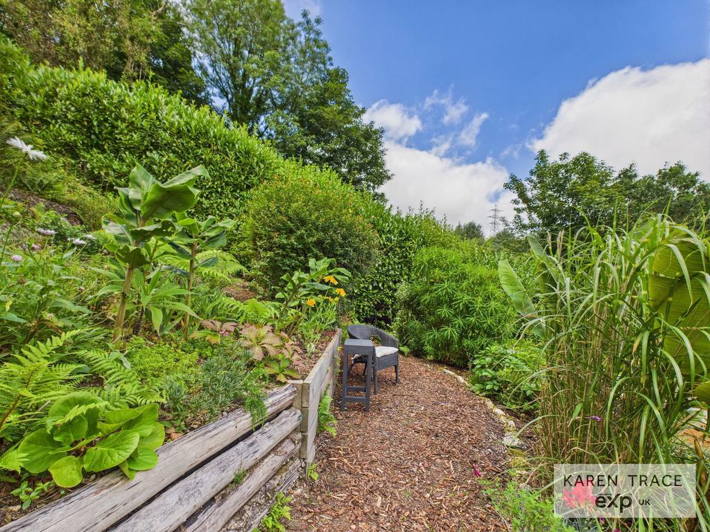 The extensive tiered woodland garden (approx. three quarters of an acre) incorporates winding paths, staged terraces, and a host of native flora and fauna. It also includes a former quarry/borrow pit, a workshop with decked veranda, and a detached timber tiny home—perfect for guests, hobbies, or as a peaceful retreat. The tiny home features a log burner, lounge/kitchen, shower room, mezzanine bedrooms, its own patio decking, and space for a hot tub (if desired).