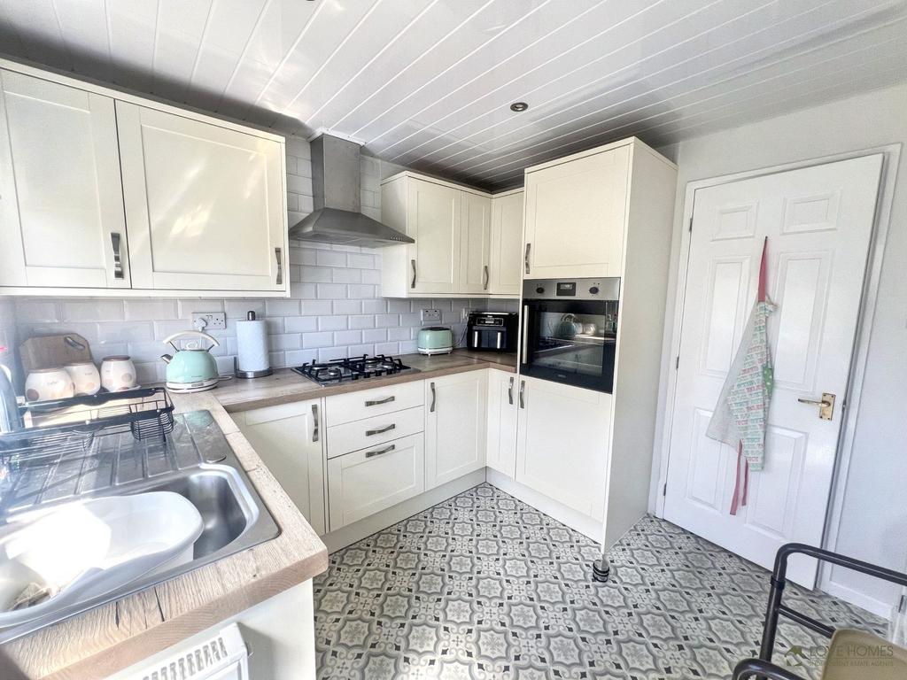 The Kitchen is fitted with a range of modern wall and base units with contrasting worktops and splashback tiling. There is a built in oven, stainless steel sink and single drainer with mixer tap, 4 burner gas hob, stainless streel extractor hood, integrated fridge and freezer, plumbing for an automatic washing machine, housing for the boiler, panelled ceiling with ceiling spotlights, upvc double glazed window and upvc double glazed door.