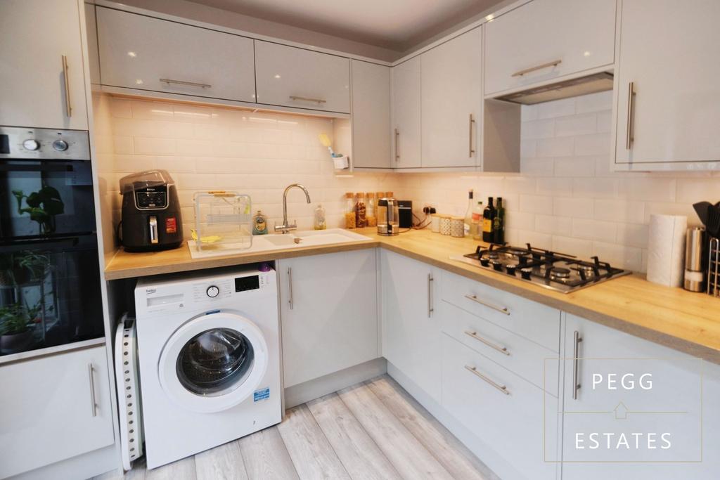 Laminate flooring. Matching range of wall and base units with work surfaces over. Integrated fridge/freezer. Plumbing for washing machine. Integrated double oven/grill x 2. Tiled splash-back. Four ring gas hob with hidden extractor above. Radiator. Double-glazed sliding doors which lead out into the garden.