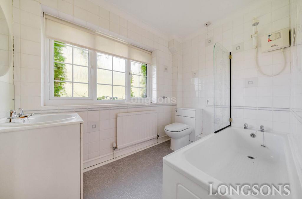 Bathroom suite comprising bath with shower over and shower screen, wash basin set within fitted cabinet, WC, tiled splashback, obscure glass UPVC double glazed window to rear, radiator.