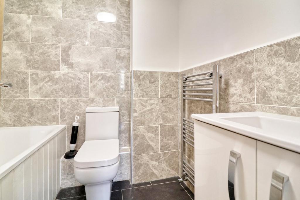 A modern bath suite comprising a panel enclosed bath with stainless steel mixer tap, thermostatically controlled wall mounted shower and glazed shower screen, button flush w.c., wash hand basin with monobloc stainless steel above and vanity unit below, wall mounted chromium heated towel rail, extractor fan, tiled walls and floor.