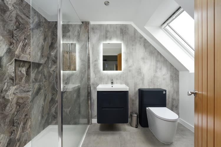 Bathroom - A bathroom on the first floor featuring a separate bath and walk-in shower, finished in contemporary grey wall and floor tiling. The room is well lit by a skylight and fitted with modern sanitary ware, maintaining a clean and stylish environment for everyday use.