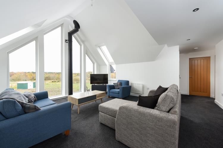 Sitting Room - 18'8" x 15'2" - A sitting room with a striking vaulted ceiling and floor-to-ceiling windows that draw in stunning views of the surrounding countryside. Furnished with a mix of comfortable sofas and armchairs in blues and greys, the room is cosy and bright with a modern wood-burning stove centrally positioned. This room is perfect for enjoying peaceful moments while appreciating the natural light and scenic vista.