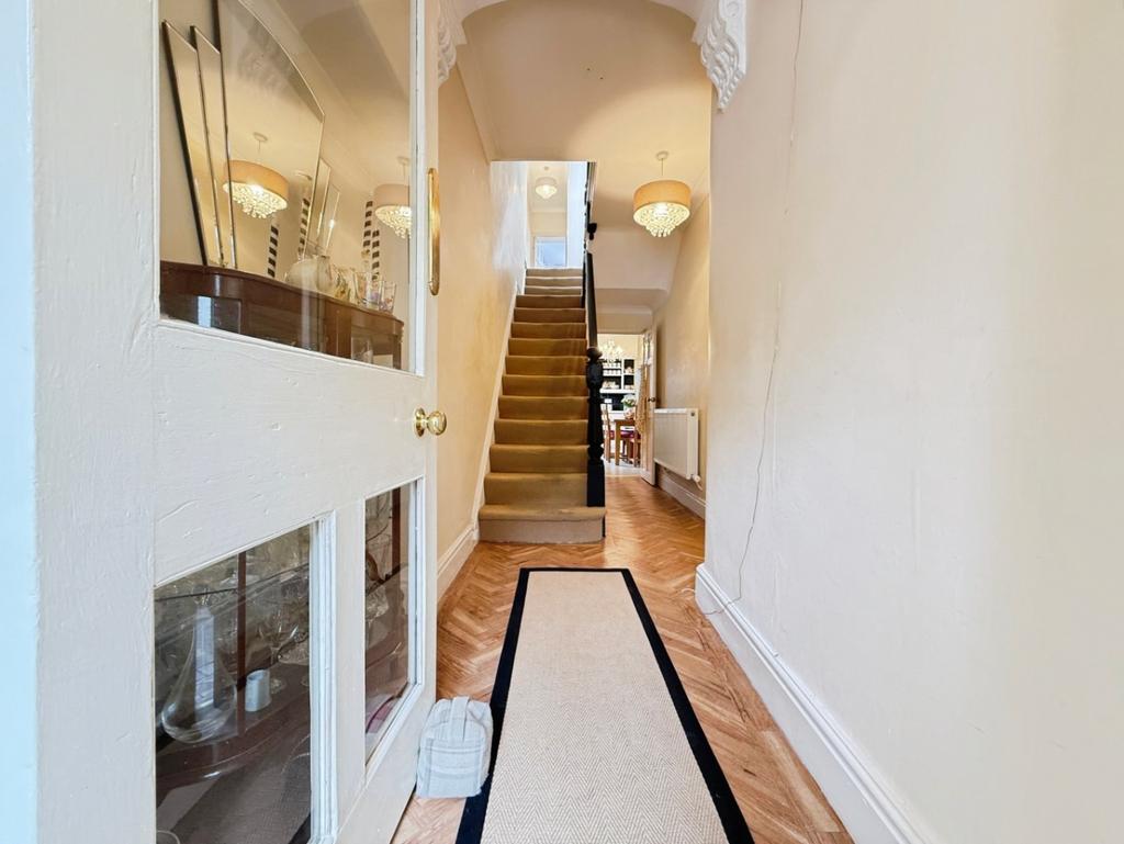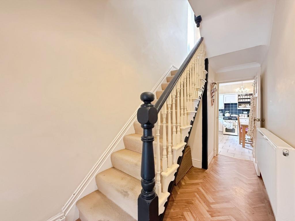 Herringbone flooring, stairs to first floor accommodation, radiator, doors into: