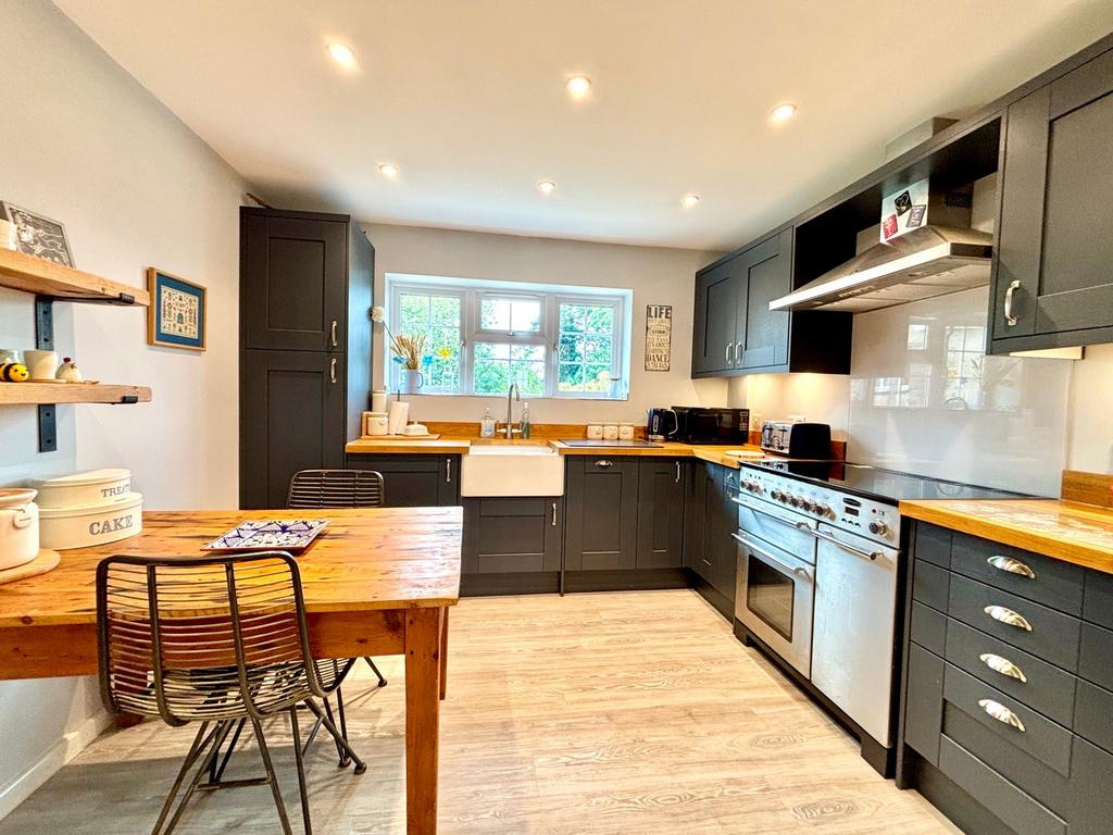 10' 6" x 10' 8" (3.20m x 3.25m) Well appointed with a modern range of wall and base mounted units incorporating a full height pull out larder cupboard with wooden work surface over with matching upstands, inset ceramic Butler sink and mixer tap, space for a Range style oven with stainless steel cooker hood over, integral fridge/freezer, integral slimline dishwasher, double glazed window to rear aspect with delightful rooftop countryside views, ample space for dining table, inset ceiling lighting.
