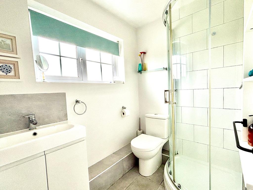 4' 9" x 6' 11" (1.45m x 2.11m) Fitted with a low level wc, vanity wash hand basin with storage beneath and mixer taps, corner shower cubicle with electric shower, double glazed obscured window to side aspect, tiled floor, chrome heated towel rail.