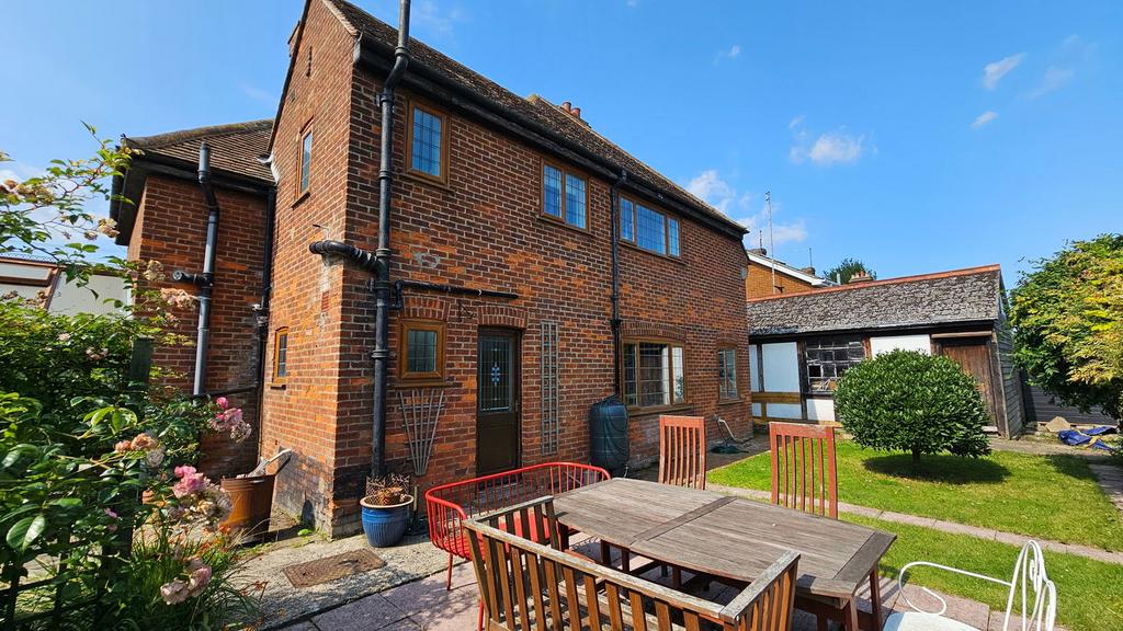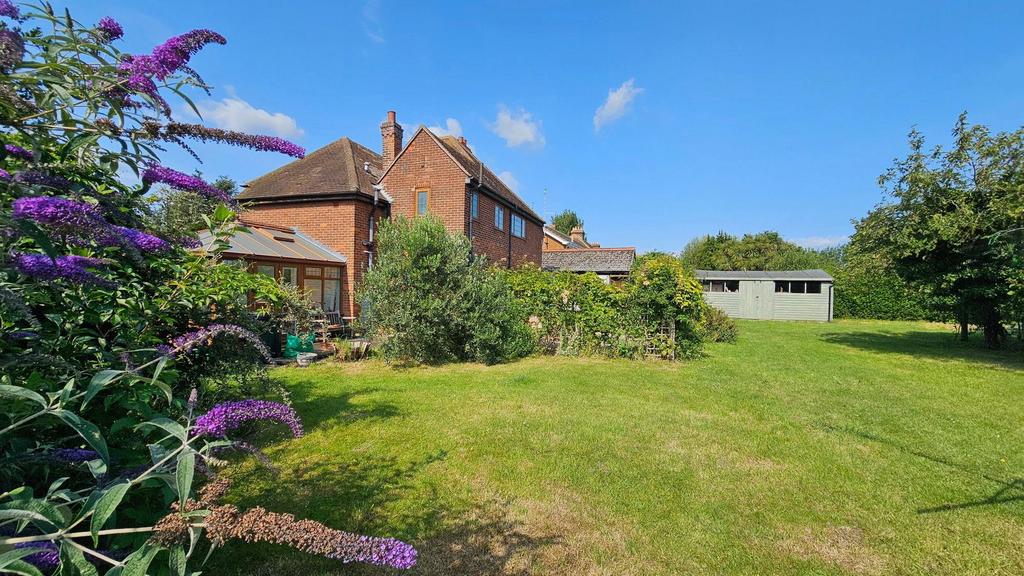 - Private rear garden with summerhouse/workshop, lawn, and sunny patio areas